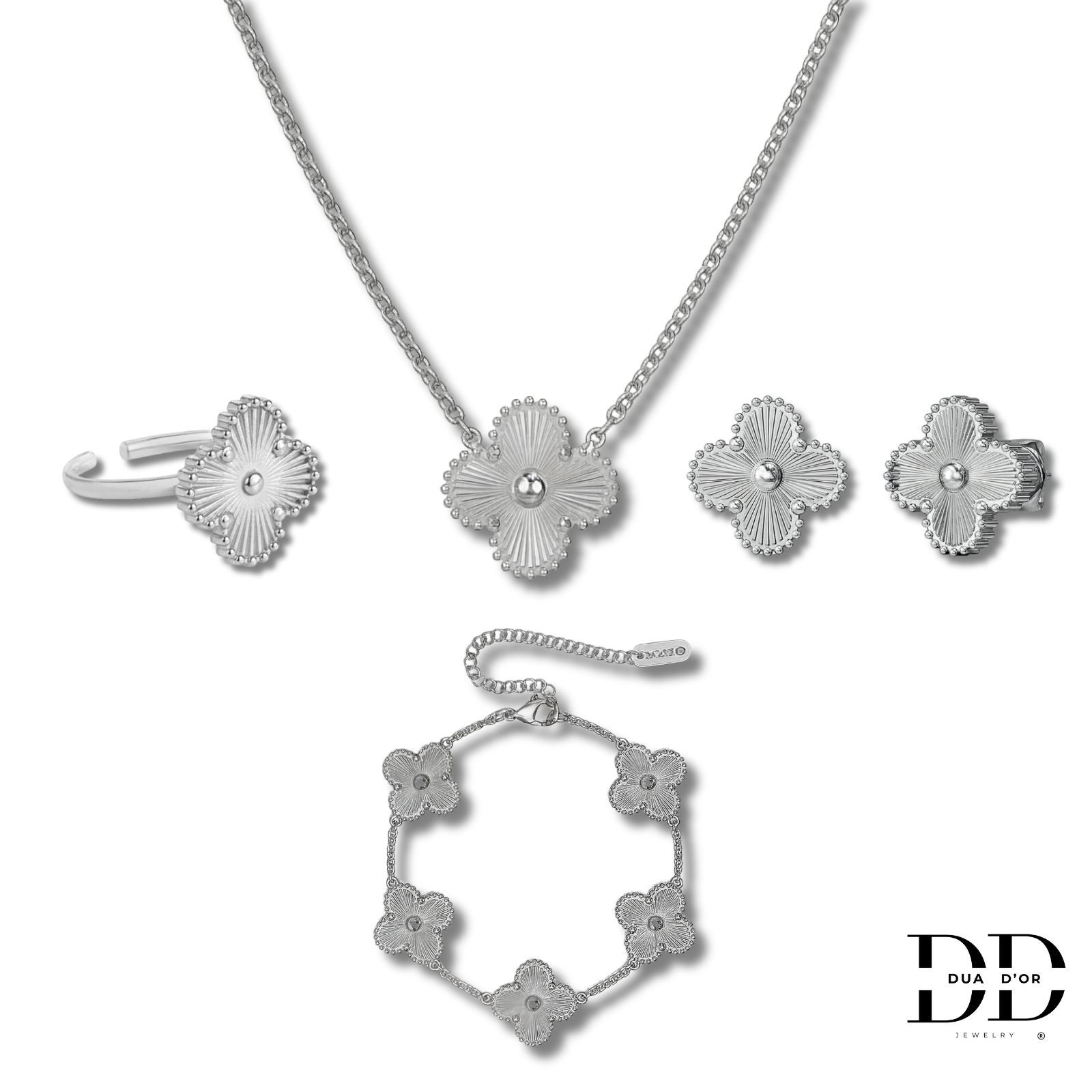 Draag de Clover Elegance set als symbool van geluk, liefde en pure elegantie in goud of zilver.