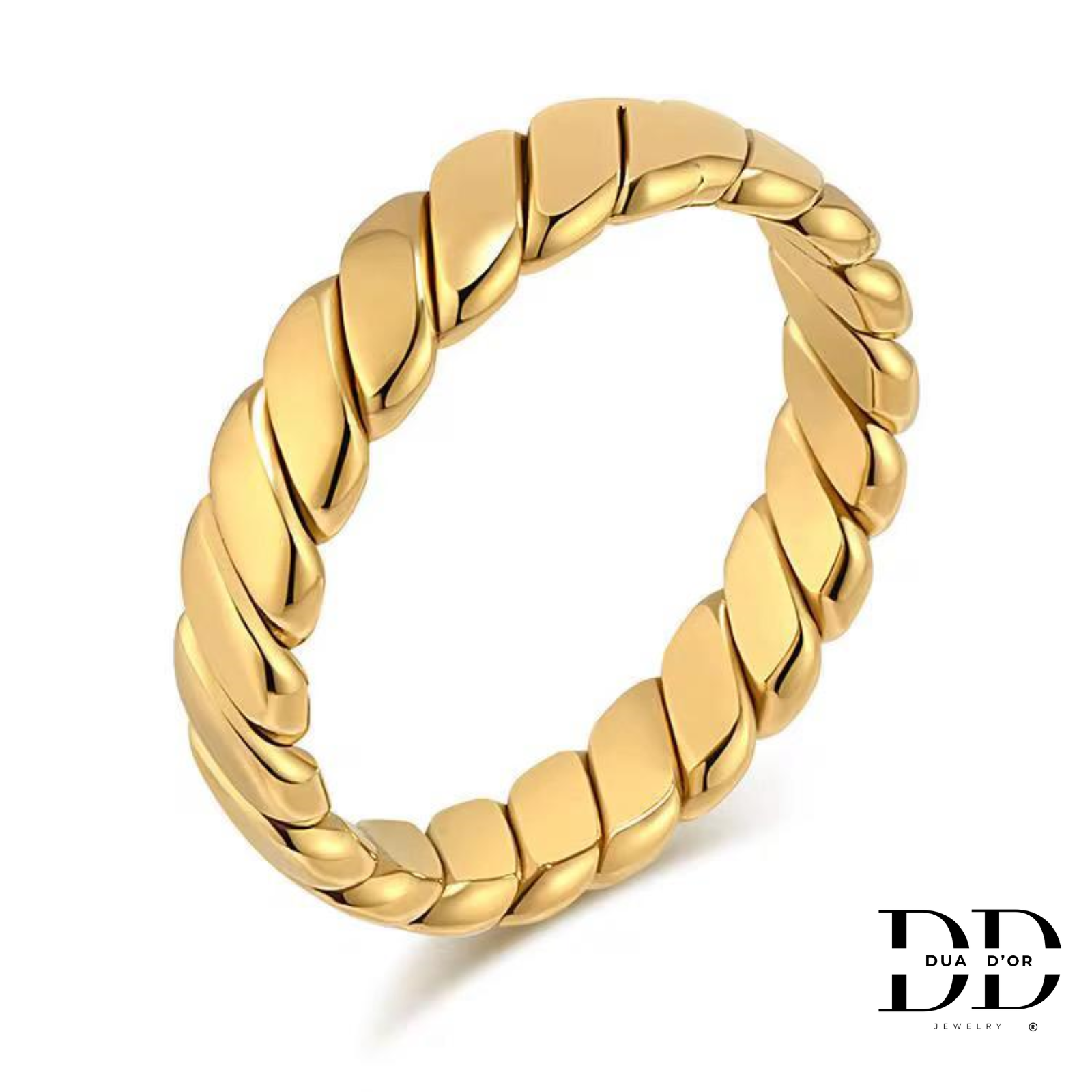 Met zijn subtiele, gevlochten schakeldesign in warm verguld goud straalt deze ring tijdloze klasse uit.