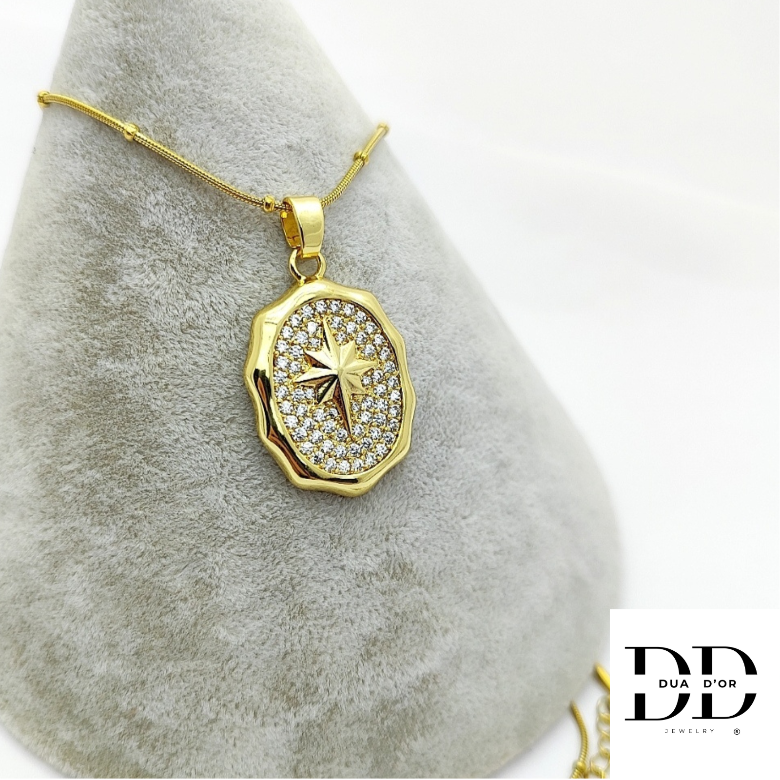 Laat je leiden door stijl met de North Star Zircon Necklace – een betoverend sieraad geïnspireerd op de magie van de sterrenhemel. Deze gouden halsketting is voorzien van een ovale hanger met een sprankelend zirconia-pavé, gecentreerd met een verhoogde, achtpuntige ster die symbool staat voor richting, hoop en elegantie. De onregelmatig gegolfde rand geeft het geheel een unieke, vintage uitstraling.