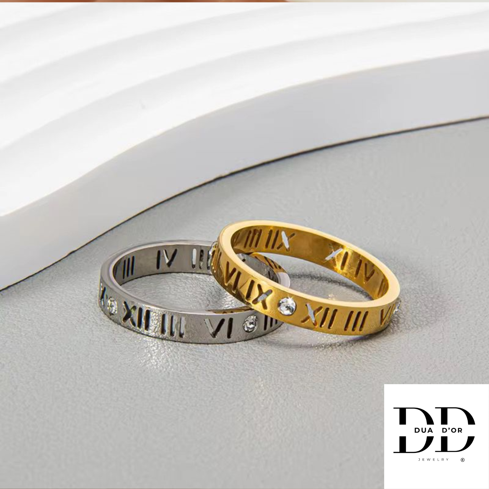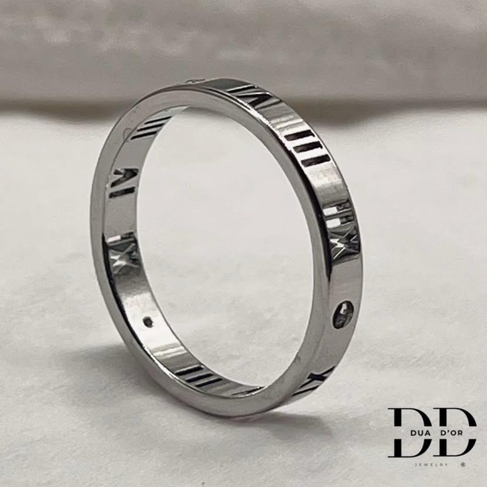 Deze stijlvolle ring combineert een klassieke uitstraling met moderne finesse. De gravures in Romeinse cijfers geven een tijdloos karakter, terwijl de subtiele Cubic Zirconia steentjes zorgen voor een elegante sprankeling.